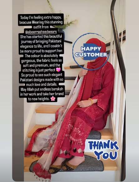 I am so happy that my Eid dress turned out to be perfect. It is my first time buying from Abeer Rasheed, and I was a bit nervous about it. Thank you for making my day.