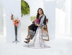 This elegant black and white three-piece outfit features a floral-embroidered shirt with striped sleeve borders, a white silk dupatta with black floral prints, and matching black embroidered trousers, combining sophistication with comfort.