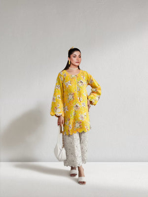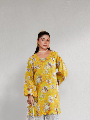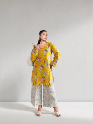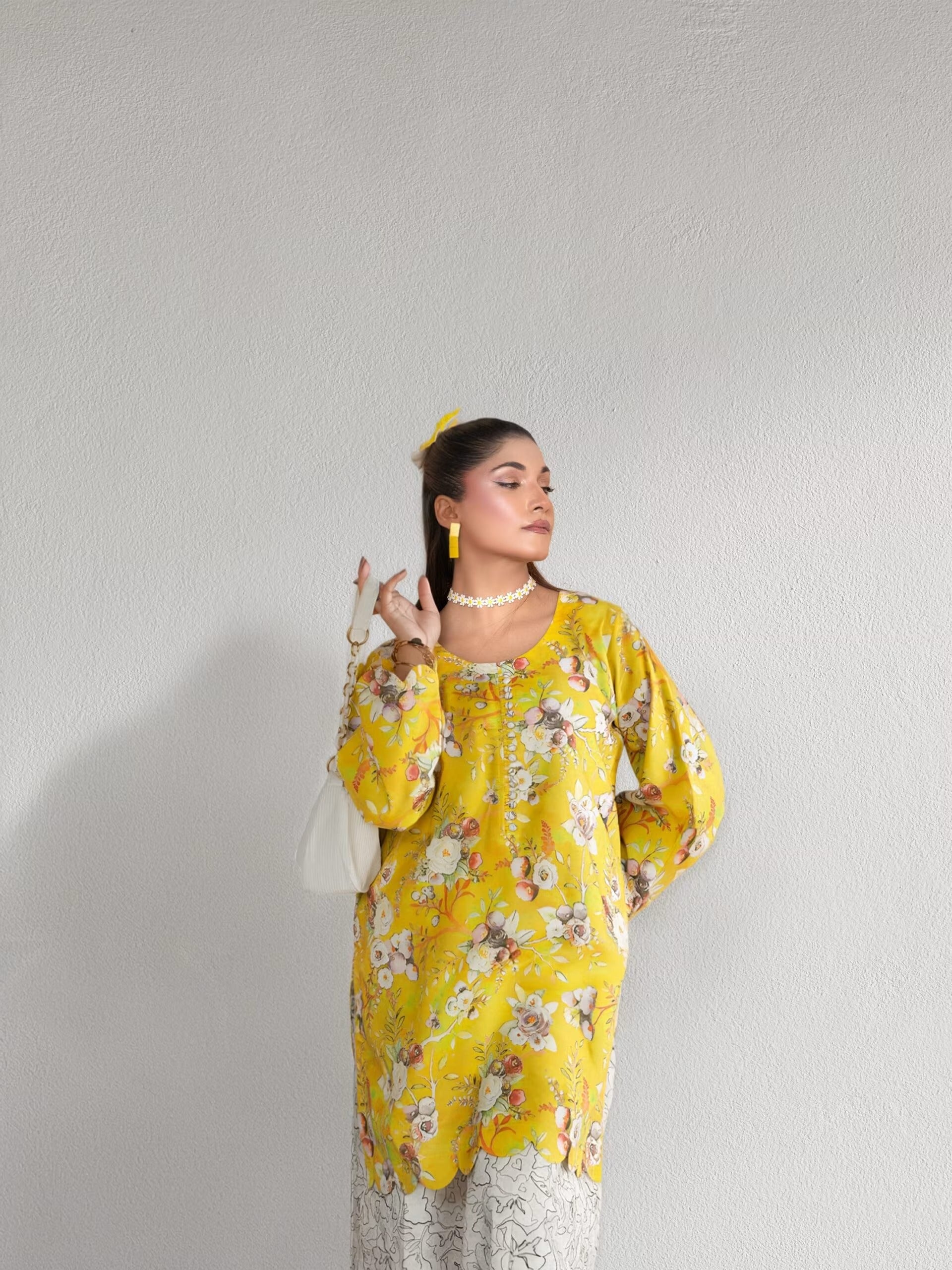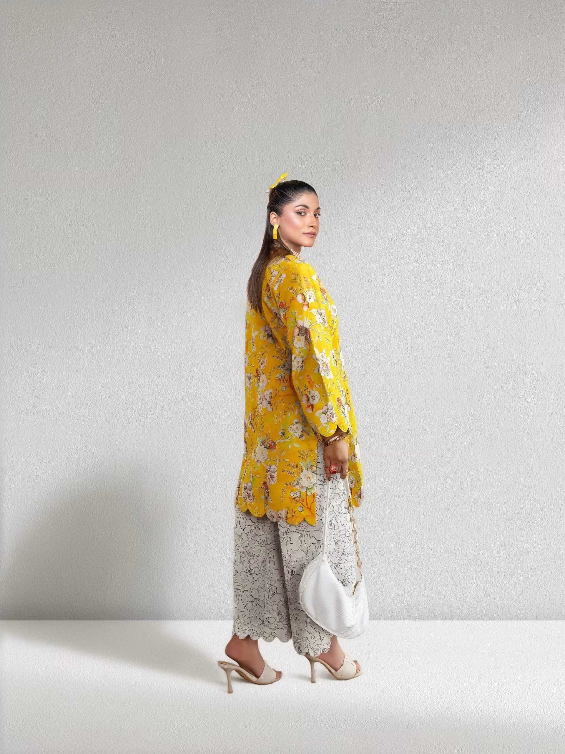 Color: Bright yellow shirt paired with white trousers featuring black details.