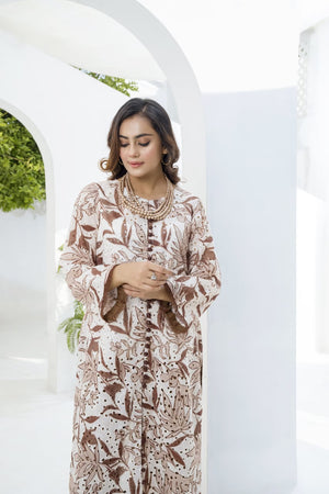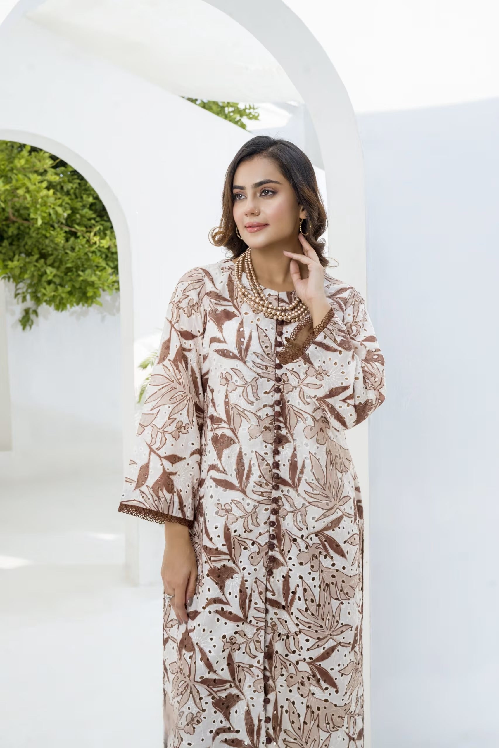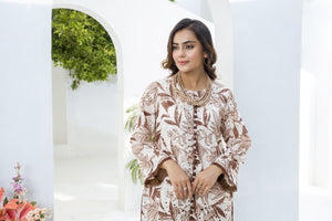 Indulge in the earthy elegance of this beige and brown floral two-piece ensemble, perfect for any occasion. The shirt showcases intricate floral embroidery on soft cotton, with subtle lace detailing on the cuffs. The elegant plain trousers complement the look.